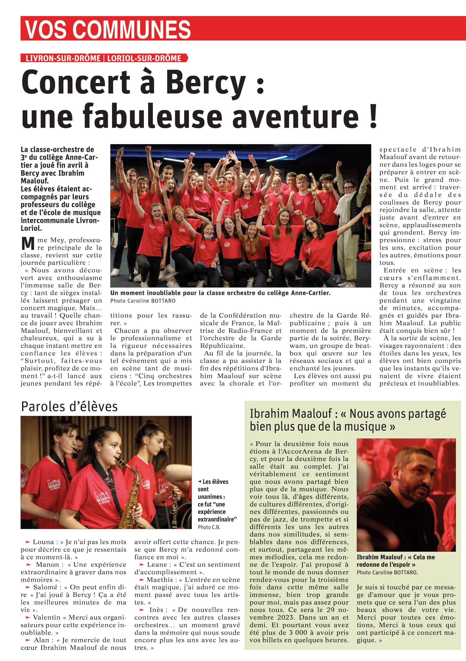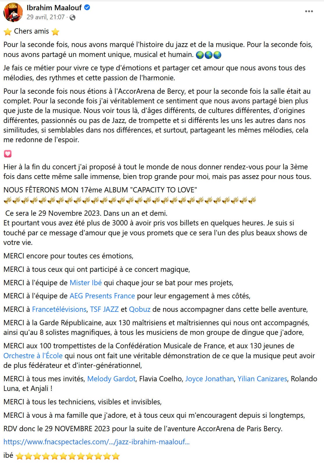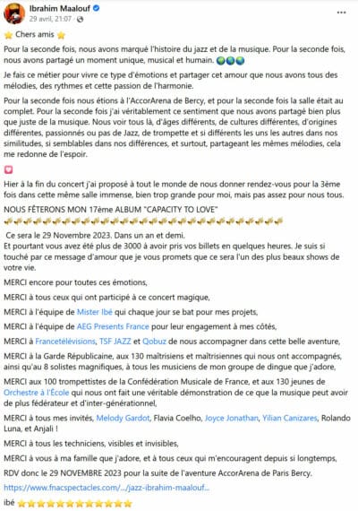 Ce fut une expérience inoubliable. Jouer avec Ibrahim Maalouf à Bercy : un bonheur ! Peu de musiciens professionnels proposent cela et se mettent au niveau des plus jeunes et des amateurs. C’est une excellente initiative pour les motiver à jouer de la trompette ou un instrument à vent, instruments qui sont de moins en moins représentés dans nos écoles de musique. La relève n’est donc plus assurée dans nos harmonies. Bravo pour tout cela ! Je tire mon chapeau ! Merci pour votre soutien et initiative.