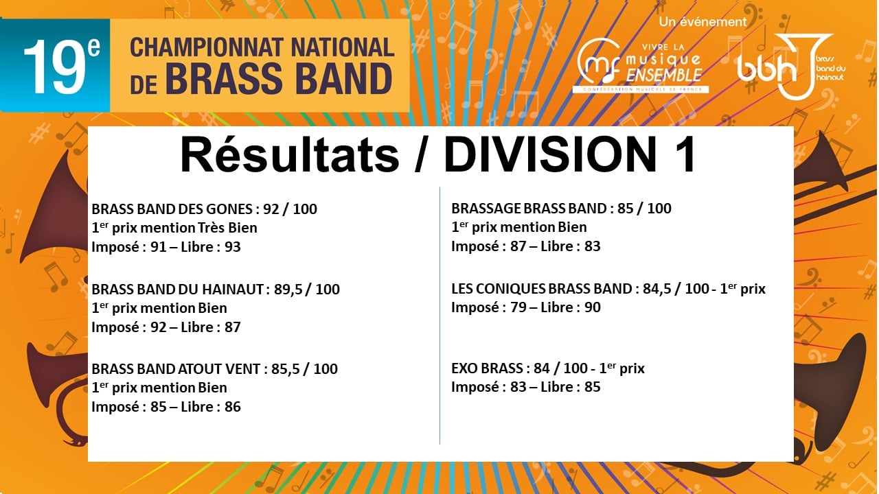 16 Brass Bands ont concouru dans 5 divisions.Bravo à tous les participants de cette nouvelle édition, et particulièrement au Hauts-de-France Brass Band, sacré champion de France pour la 5ème année consécutive !