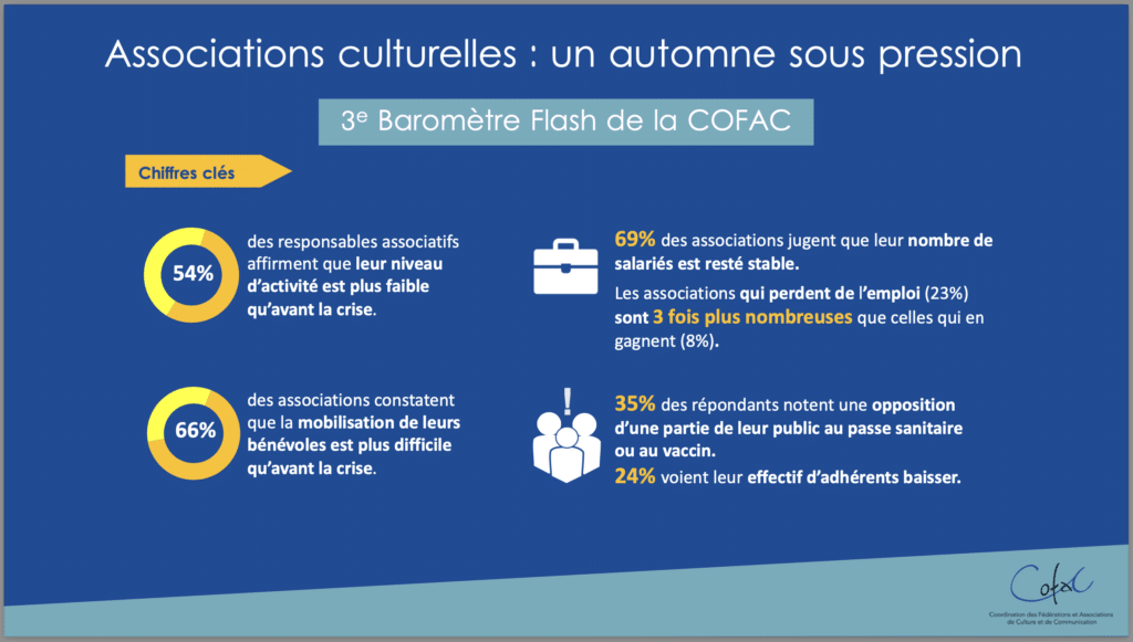 Depuis le début de la crise sanitaire, le Baromètre Flash de la COFAC mesure la pression et sonde les associations culturelles afin de mieux comprendre et anticiper leurs besoins. Ce 3e Baromètre Flash s’est tenu en ligne du 22 octobre au 5 novembre 2021 auprès des responsables d’associations culturelles.