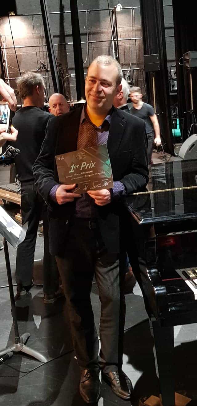 Avant la création, j’avais cependant eu quelques retours techniques par le chef d’orchestre, Xavier Scheid, mais j’ai entendu la Symphonie Imaginaire pour la première fois lors de la répétition générale, je l’ai presque découverte en même temps que le public. C’était quasiment comme je l’imaginais. Les compositeurs étaient autorisés à faire brièvement quelques commentaires à l’orchestre. Cette proposition a été très marquante pour moi : comment dire en 5 minutes à de nombreux excellents musiciens ce qui pourrait être amélioré d’ici le concert quelques heures plus tard. J’ai fait appel à mon expérience d’enseignant pour trouver les mots justes, percevoir ce que les musiciens pouvaient entendre pour s’améliorer encore en très peu de temps. Leur interprétation lors du concert a été magistrale, les corrections parfaitement intégrées : crescendos exagérés par tous, sans dépendre uniquement du chef d’orchestre. Cela a été une formidable expérience. Xavier Scheid a été très investi, dévoué, et beaucoup de sympathie s’est créée entre nous, confirmée le week-end du concours.