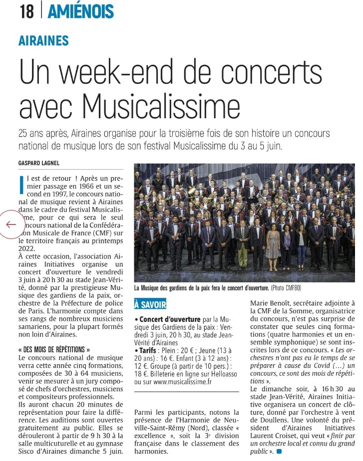 25 ans après, Airaines organise pour la troisième fois de son histoire un concours national de musique lors de son festival Musicalissime du 3 au 5 juin. Par Gaspard LAGNEL Il est de retour ! Après un premier passage en 1966 et un second en 1997, le concours national de musique revient à Airaines par Gaspard Lagnel