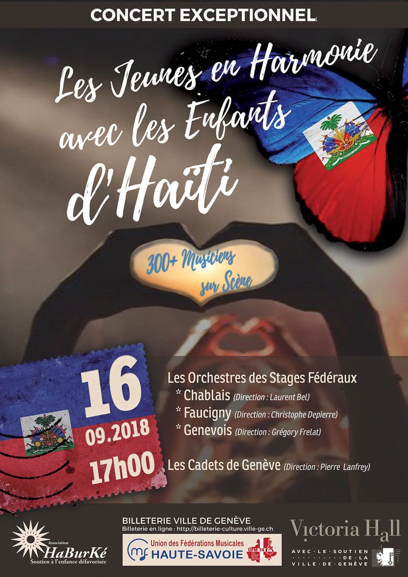 Le Dimanche 16 septembre 2018, sous l’impulsion de Philippe Maso, président fondateur d’HaBurKé qui œuvre en Haïti, au Burkina Faso ainsi qu’au Kenya pour améliorer le quotidien des enfants, et par ailleurs ancien président de la fédération musicale du Chablais et ancien directeur fondateur de l’Harmonie municipale de Machilly Saint-Cergues (74), les orchestres d’harmonie des stages fédéraux du Chablais, Faucigny et Genevois (membres de l’union des fédérations musicales de Haute-Savoie) ainsi que l’orchestre d’harmonie des Cadets de Genève, ont partagé la mythique scène du Victoria Hall de Genève pour un grand concert placé sous le signe de la solidarité de la jeunesse envers les enfants d’Haïti.