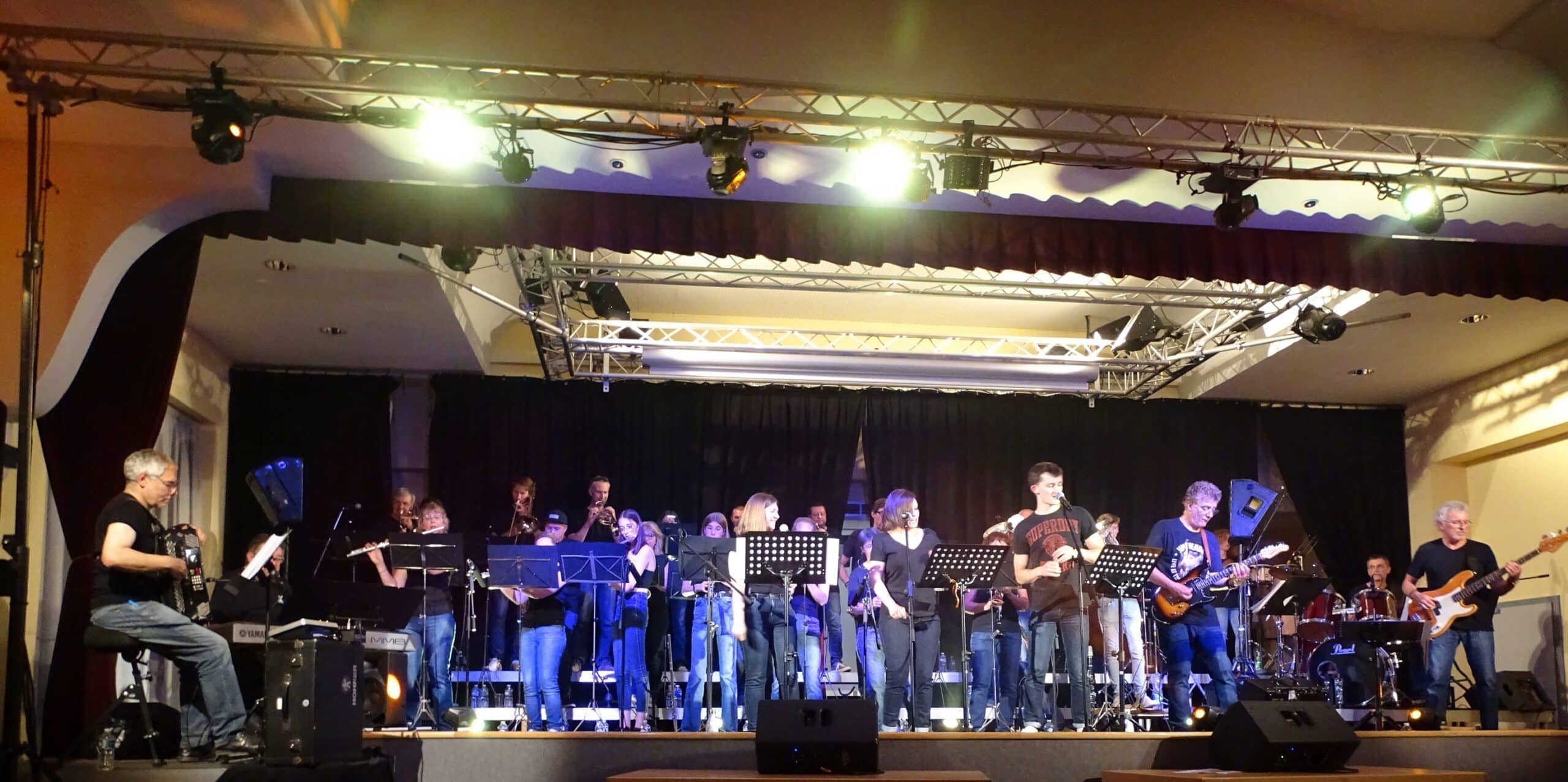 Le concept de notre Ilienrock : changer de style pour attirer un nouveau public et de nouveaux musiciens. Pour cela, nous nous sommes lancés dans un concert 100 % pop rock. Il s’agit assurément du seul concert de ce type organisé et interprété par un orchestre d’Harmonie en Alsace, et sur deux soirs ! Pour réussir ce challenge, deux guitaristes, deux synthés et quatre chanteurs ont renforcé l’orchestre d’Harmonie et ont réuni plus de 30 musiciens sur scène !