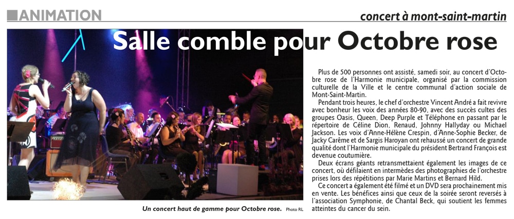 Concert organisé pour la campagne Octobre Rose, qui a permit à l’orchestre de travailler avec 4 chanteurs sur un choix d’une vingtaine de chansons des années 80-90. Le choix a été fait en accord entre chaque chanteur et l’arrangeur (musiciens de l’orchestre).