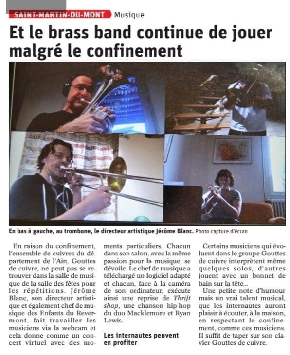 Période de confinement mars-mai 2020 : le brass Band Gouttes de Cuivres “s’amuse à faire de la musique à distance” : en mal de répétitions, le chef d’orchestre Jérôme Blanc a eu l’idée de trouver un truc pour que les amateurs ne perdent rien de leur aisance et donner du grain. D’où l’idée folle d’un clip de l’orchestre à la maison pour garder le lien avec les musiciens.