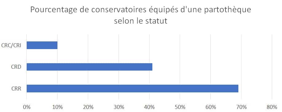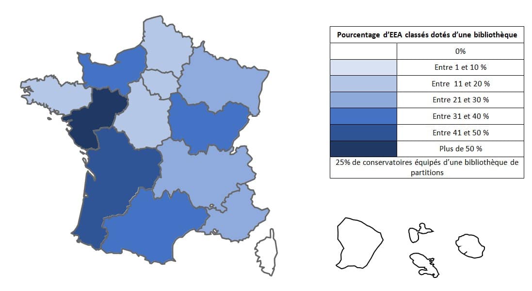 L’accès aux bibliothèques de partitions n’est donc toujours pas une évidence, même si certaines régions sont nettement mieux dotées que d’autres : en Pays de la Loire notamment, avec plus de la moitié de ses conservatoires classés disposant d’une « véritable bibliothèque », contre 14% seulement pour les Hauts de France ou même aucune pour l’Outre-mer et la Corse.
