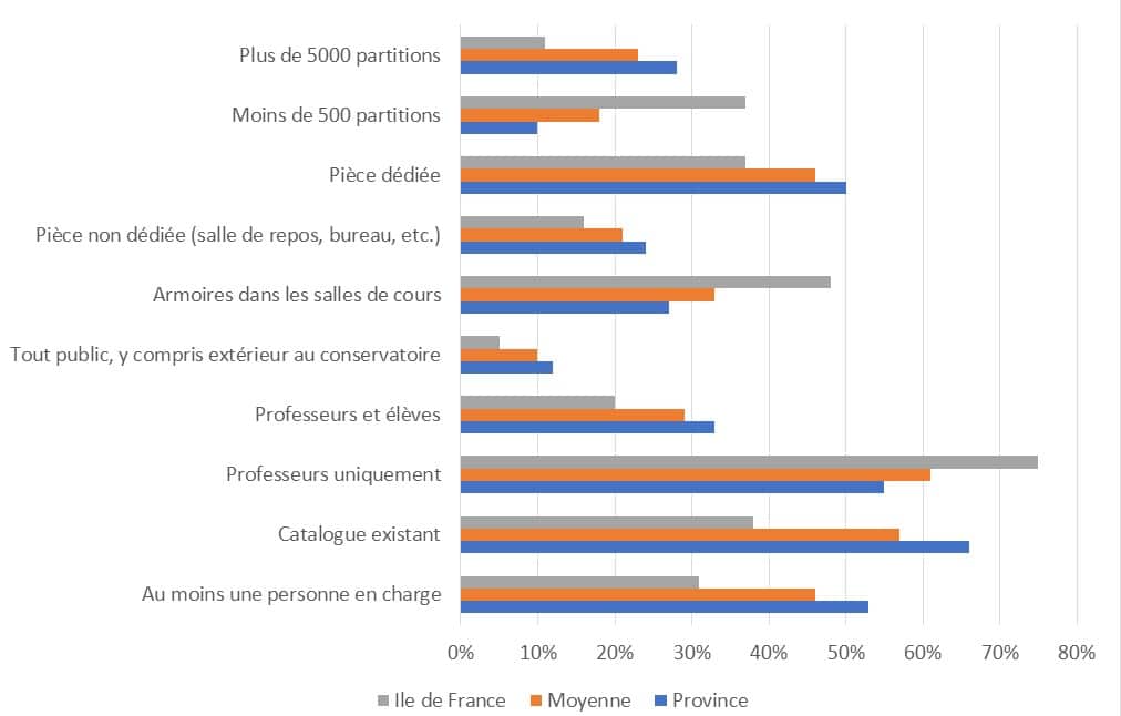 Comparativement aux franciliens, les conservatoires provinciaux sont souvent mieux pourvus : fonds plus importants, catalogues plus fréquents et salles dédiées plus habituelles. La région parisienne concentrant plusieurs bibliothèques spécialisées sur un petit territoire, comme la Médiathèque Musicale de Paris, celle de la Philharmonie de Paris ou bien la Médiathèque Musicale Mahler, on peut supposer qu’elles diminuent l’intérêt de constituer une bibliothèque dans les conservatoires. Toutefois, avoir un fonds de partitions, peu importe sa taille, ne signifie pas avoir une bibliothèque en tant que telle. Même si les chiffres sont moins prononcés qu’en Ile de France, certains établissements sont contraints de répartir leurs partitions dans plusieurs salles de cours.