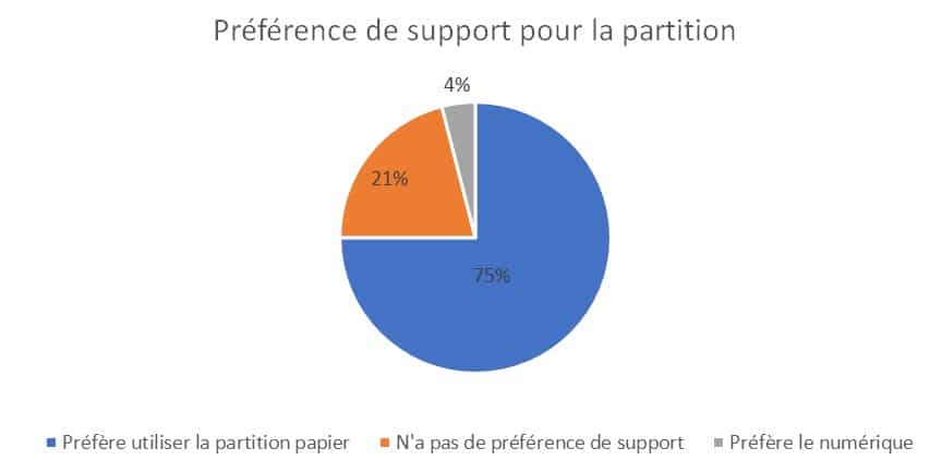 Trois personnes sur quatre déclarent ainsi préférer la ver¬sion papier, mais ils sont tout autant à quand même utiliser des offres numériques pour découvrir des partitions. Cependant, de nouveaux services comme Nkoda, sorte de Netflix de la partition, ne parviennent pas pour autant à pénétrer au sein du marché français. La demande semble principalement se diriger vers des partitions majoritairement gratuites et/ou libres de droit, permettant aux utilisateurs d’imprimer eux-mêmes ce dont ils ont besoin, usage qui se situe aux antipodes du modèle traditionnel de l’édition de partitions.