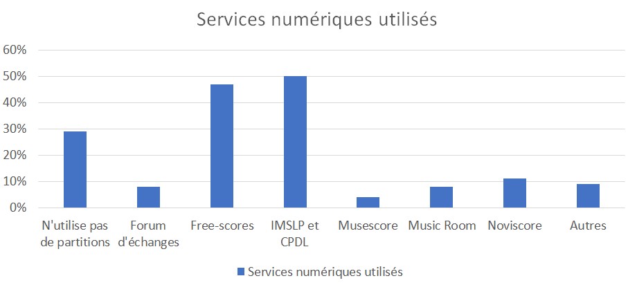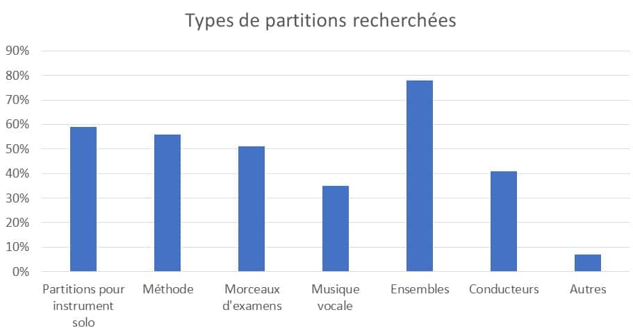 Toutefois, ces offres numériques ne semblent pas non plus répondre à tous les besoins de partitions : la musique d’ensemble est particulièrement recherchée, peut-être en raison d’une augmentation de la pratique collective en EEA. Or, celle-ci est relativement rare parmi les offres numériques gratuites, et souvent compliquée à chercher : rares sont en effet les catalogues permettant d’identi¬fier des partitions en fonction de formations aux effec¬tifs et aux instruments très variables.