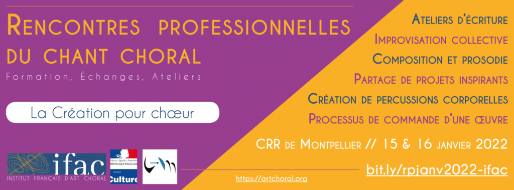 L’IFAC organise les Rencontres professionnelles du chant choral les 15 et 16 janvier 2022 sur la thématique de la Création pour chœur, au CRR de Montpellier, en partenariat avec le CRR de Montpellier et le GAM de Pau.