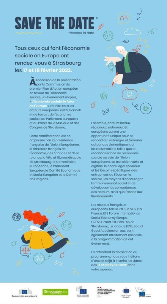 Le sommet européen de l’économie sociale est un évènement co-organisé par la Présidence française de l’Union européenne, le ministère français de l’Économie, des finances et de la relance, la Ville et Eurométropole de Strasbourg, la Commission européenne, le Parlement européen, le Comité économique et social européen et le Comité des régions.